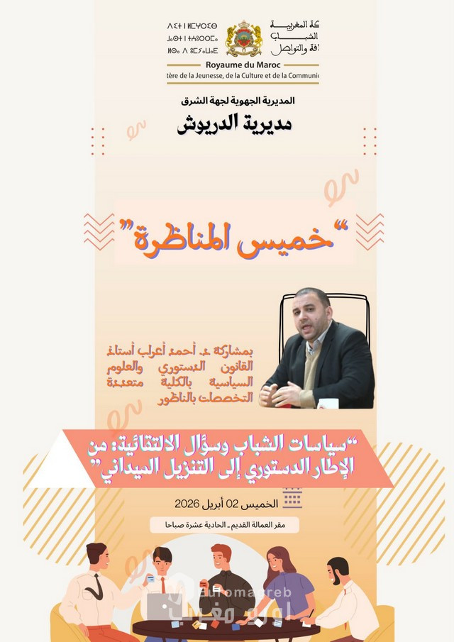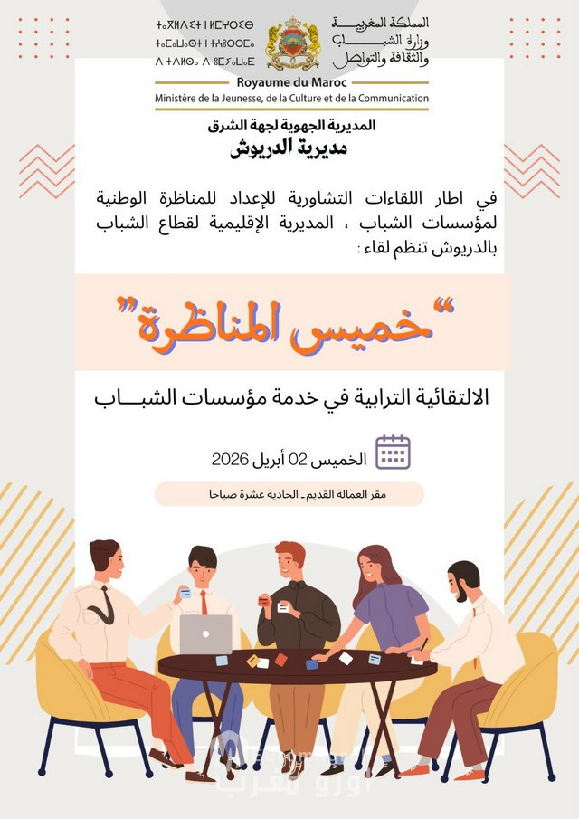 تحتضن المديرية الإقليمية لقطاع الشباب بالدريوش، يوم غد الخميس 02 أبريل 2026، لقاءً تشاوريًا بمقر العمالة القديم، بمشاركة رؤساء المصالح الخارجية، وممثل القسم الاجتماعي بعمالة الإقليم، إلى جانب عدد من الفاعلين الجمعويين.
