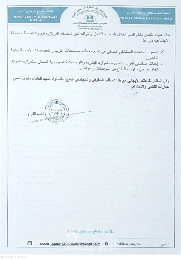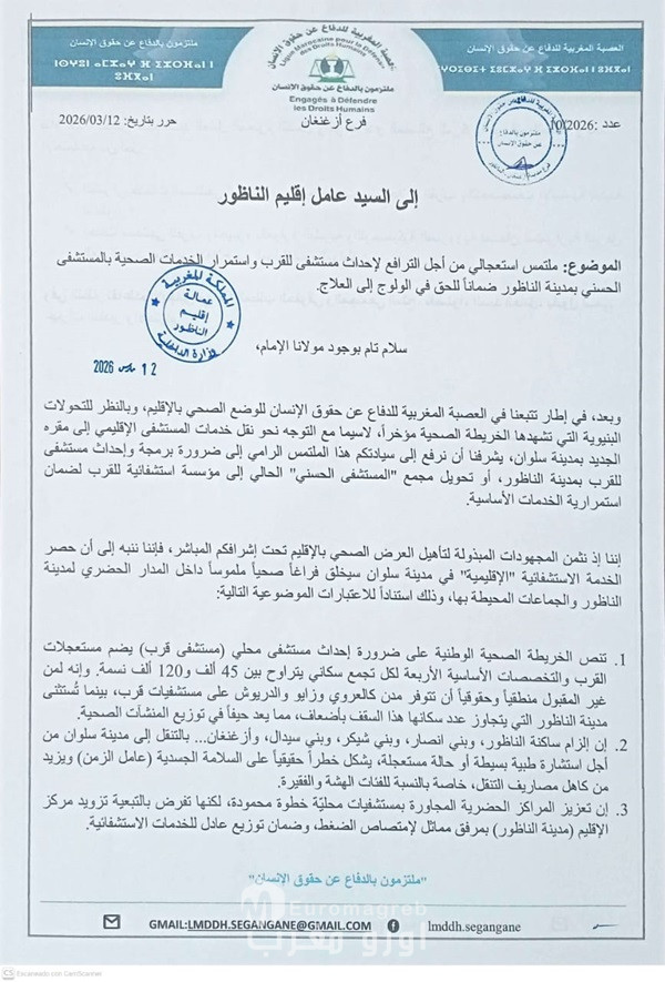 وبعد، في إطار تتبعنا في *العصبة المغربية للدفاع عن حقوق الإنسان* للوضع الصحي بالإقليم، وبالنظر للتحولات البنيوية التي تشهدها الخريطة الصحية مؤخراً، لاسيما مع التوجه نحو نقل خدمات المستشفى الإقليمي إلى مقره الجديد بمدينة سلوان، يشرفنا أن نرفع إلى سيادتكم هذا الملتمس الرامي إلى ضرورة برمجة وإحداث **مستشفى للقرب بمدينة الناظور**، أو تحويل مجمع “المستشفى الحسني” الحالي إلى مؤسسة استشفائية للقرب لضمان استمرارية الخدمات الأساسية.