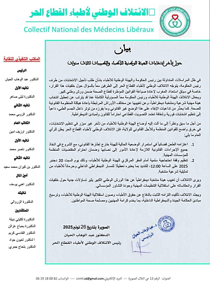 ويجدّد الائتلاف تأكيده التزامَه الثابت بالدفاع عن حقوق الأطباء، وصون استقلالية الهيئة الوطنية للأطباء، وترسيخ مبادئ الحكامة الجيدة والديمقراطية الداخلية، بما يخدم كرامة المهنيين ومصلحة صحة المواطنين.