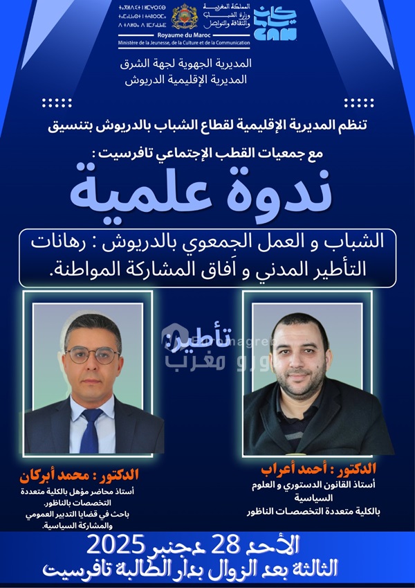 يستعد إقليم الدريوش احتضان ندوة علمية حول موضوع “الشباب والعمل الجمعوي بالدريوش: رهانات التأطير المدني وآفاق المشاركة المواطنة”، وذلك يوم الأحد 23 دجنبر بفضاء دار الطالبة بجماعة تافرسيت، بتنظيم من المديرية الإقليمية لقطاع الشباب وبشراكة مع فعاليات من النسيج الجمعوي وجمعيات القطب الاجتماعي بتافرسيت.