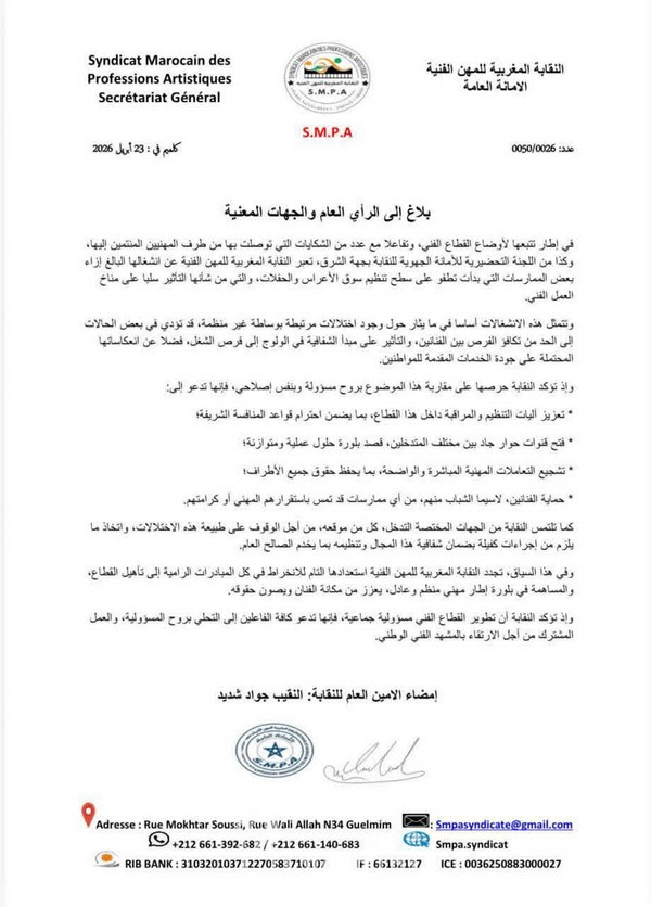وفي ختام بلاغها، جدّدت النقابة المغربية للمهن الفنية استعدادها للانخراط في كل المبادرات الرامية إلى تأهيل القطاع، والمساهمة في بناء إطار مهني منظم وعادل، يعزز مكانة الفنان ويصون حقوقه.