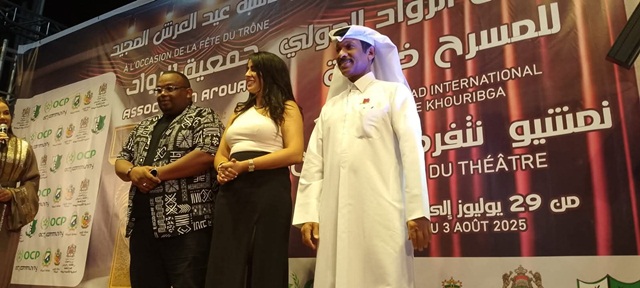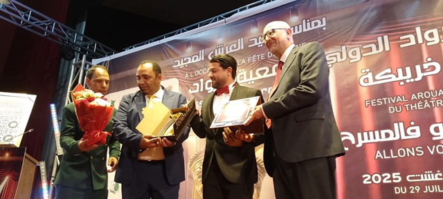 افتتحت فعاليات الدورة العاشرة لمهرجان الرواد الدولي للمسرح بخريبكة الذي ينظم بمناسبة عيد العرش المجيد والذي سيستمر إلى غاية يوم 03 غشت 2025 بالمركب الثقافي محمد السادس بخريبكة تحت شعار ”نمشيو نتفرجو فالمسرح”، في بداية هذا الحفل الذي حضرته شخصيات وازنة من فنانين ومنتخبين ورجال الصحافة والإعلام وجمهور دواق لأب الفنون المسرح والذي تكلفت بتقديم جميع فقراته الفنانة حسناء المومني تقدم الفنان والمبدع عبد الرزاق بن عامر عن إدارة المهرجان حيت رحب في مستهلها بالحضور وبالجمهور وبالمكرمين وشكر كل المدعمين الرئيسين للمهرجان وشكر كل النجوم القادمين من داخل المغرب وخارجه وأعلن عن انطلاق مراسيم افتتاح الدورة العاشرة للمهرجان، وبعد ذلك اخد الكلمة السيد عبد الجليل جعداوي نيابة عن السيد رئيس المجلس الترابي لخريبكة حيث نوه في مستهلها بالمهرجان الذي اصبح يدخل في أجندة الأنشطة الثقافية التي يشهدها الإقليم واعتبر أن المجلس الجماعي شريك مع المهرجان الناجح الذي دام عشر سنوات على أمل أن تحقق الدورة العاشرة نجاحا كغيرها من الدورات السابقة، وما يزيد الدورة نجاحا هو تزامنها مع الذكرى 26 لتربع صاحب الجلالة الملك محمد السادس على عرش اسلافه المنعميين .