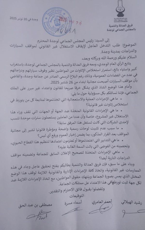 يشهد ملف مواقف السيارات بمدينة وجدة تطورا جديدا يعيد النقاش إلى الواجهة، بعدما وجه فريق العدالة والتنمية بالمجلس الجماعي مراسلة رسمية إلى رئيس الجماعة يطالبه فيها بالتدخل العاجل لوقف ما وصفه بـ “الاستغلال غير القانوني” لمواقف السيارات والدراجات بعدد من شوارع المدينة، رغم القرار الجماعي القاضي بمجانية هذه المرافق ابتداءً من 26 شتنبر 2025.