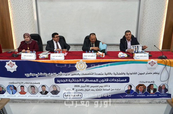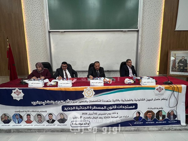 احتضنت الكلية متعددة التخصصات بالناظور، مساء يوم الخميس 02 أبريل 2026، فعاليات الدورة الأولى لفن المرافعة التي نظمتها ماستر المهن القانونية والقضائية، في موضوع راهن ومحوري يتعلق بـ “مستجدات قانون المسطرة الجنائية الجديد”، وسط حضور وازن من الطلبة الباحثين والمهتمين بالشأن القانوني.