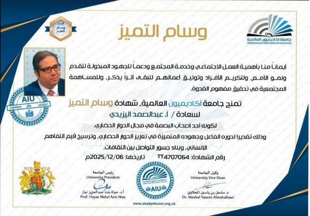 وفي افتتاح المؤتمر، منحت جامعة أكاديميون الدولية وسام التميز للسيد عبدالصمد اليزيدي*، اعترافًا بإسهاماته البارزة في *تعزيز الحوار الحضاري، وترسيخ ثقافة السلم المجتمعي، وخدمة قضايا المسلمين في السياق الأوروبي.