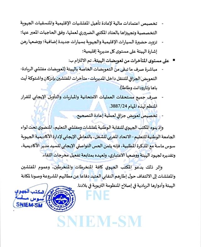 مباشرة صرف ما تبقى من التعويضات الخاصة بالهيئة (تعويضات مفتشي الريادة-التعويض الجزافي للتنقل داخل المديريات – متأخرات المفتشين بإنزكان واشتوكة أيت باها وتارودانت وطاطا).