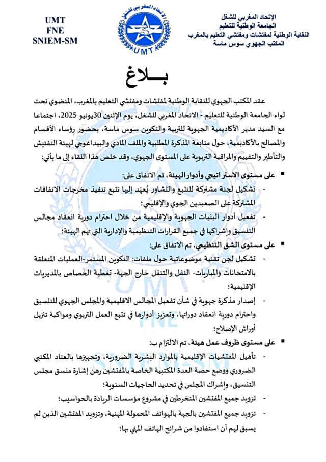 عقد المكتب الجهوي للنقابة الوطنية لمفتشات ومفتشي التعليم بالمغرب، المنضوي تحت لواء الجامعة الوطنية للتعليم – الاتحاد المغربي للشغل، يوم الإثنين30 يونيو 2025، اجتماعا مع السيد مدير الأكاديمية الجهوية للتربية والتكوين سوس ماسة، بحضور رؤساء الأقسام والمصالح بالأكاديمية، حول متابعة المذكرة المطلبية والملف المادي والبيداغوجي لهيئة التفتيش والتأطير والتقييم والمراقبة التربوية على المستوى الجهوي، وقد خلص هذا اللقاء إلى ما يأتي:
