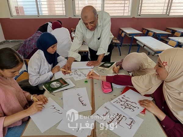 ليختم ذلك بفتح الورشة امام الشق التطبيقي، حيث منحت الفرصة للتلاميذ لملامسة أدوات العمل من قصب ومداد، وتجريب عينة من الخط بغاية الوقوف على أبعاده الجمالية، بالاضافة الى ما زودهم به من بخبرته وتجربته الطويلتين في مجال التشكيل الحروفي، عندما اطلعهم على آليات تشكيل الخطوط والمنحنيات وطرق وضع التصميم التشكيلي.