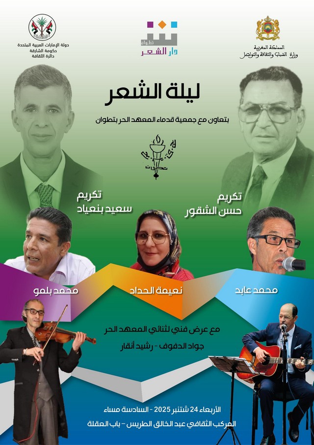 بتعاون مع جمعية قدماء المعهد الحر، تنظم دار الشعر بتطوان ليلة جديدة من ليالي الشعر، يوم الأربعاء 24 شتنبر الجاري، في فضاء المركب الثقافي عبد الخالق الطريس بمدينة تطوان، ابتداء من الساعة السادسة مساء. ويشهد هذا اللقاء تكريم أستاذ الأجيال والمربي الراحل حسن الشقور، المدير السابق للمعهد الحر بتطوان. بينما يشارك في ليلة الشعر هاته الشاعر محمد عابد والشاعرة نعيمة الحداد والشاعر محمد بلمو، مع عرض فني لثنائي المعهد الحر الأستاذ جواد الدفوف والأستاذ رشيد أنقار. مثلما يشهد اللقاء تكريم الشاعر سعيد بنعياد، أحد خريجي المعهد، في بداية الثمانينيات.