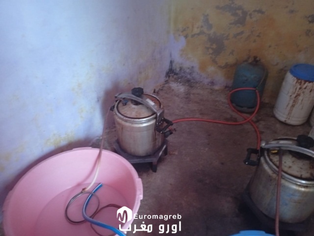 وداهم المتدخلون الدركيون، بتعليمات نيابية، المنزل، وأجروا بداخله تفتيشا، بحضور زوجة المشتبه به، المسمى (ع.)، الذي يوجد في حالة عود (récidive)، المفرج عنه مؤخرا، بعد أن قضى عقوبة سالبة للحرية، على خلفية إنشاء مصنع تقليدي لتقطير مسكر “الماحيا” والاتجار فيه. إذ تم ضبط وحجز: 7 براميل من فئة 200 لتر، مملوءة بحبوب الشعير المخمر، و14 برميل من فئة 30 لتر، مملوءة كدلك بحبوب الشعير المخمر، و4 طناجر ضغط من الحجم الكبير، و4 أنابيب نحاسية للتقطير، و4 مواقد غاز متوسطة الحجم، و80 علبة خميرة من نوع جرما، وزن 125 غرام، و30 قنينة من سعة 5 لتر فارغة، و40 لترمن مسكر ماء الحياة مقطرة وجاهزة، و18 كيس من مسحوق السكر “سندة”، من وزن 2 كلغ للواح، وقنينتي غاز من الحجم الكبير، و5 كيلوغرام من حبوب الشعير.