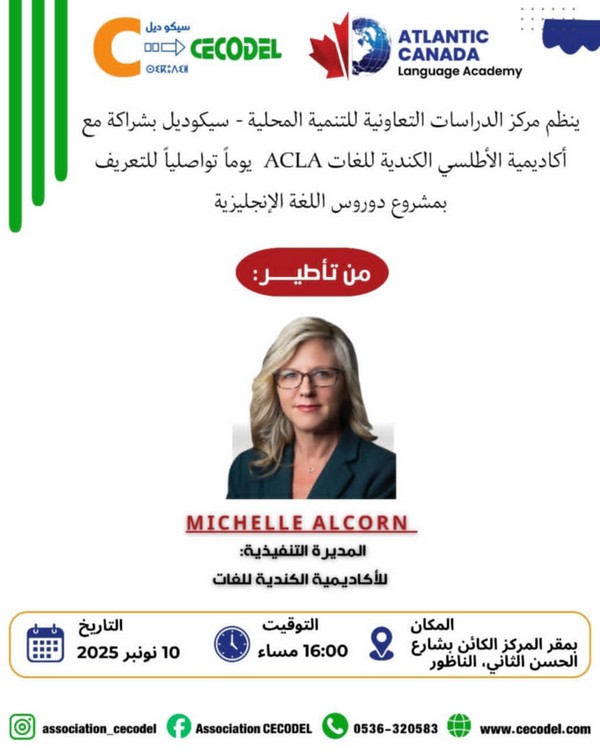 وستشرف على تأطير هذا اللقاء شخصية أكاديمية بارزة هي السيدة ميشيل ألكورون (MICHELLE ALCORON)، المديرة التنفيذية للأكاديمية الكندية للغات، التي ستقدم شرحاً مفصلاً حول محتوى البرنامج، المنهجية المتبعة، وكيفية التسجيل والاستفادة من الدروس التي سيشرف عليها أطر مؤهلة.