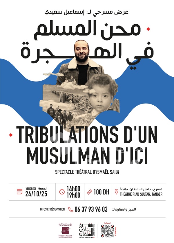 Le mois d’octobre se clôturera en profondeur et en émotion vendredi 24 octobre, avec deux représentations (à 14h00 et 19h00) de la pièce « Tribulations D’un musulman d’ici » d’Ismaïl Saidi, présentées en partenariat avec la Fondation Hassan II pour les Marocains résidant à l’étranger.