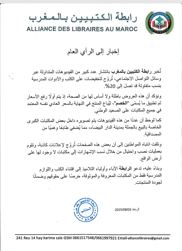 تُخبر رابطة الكتبيين بالمغرب بانتشار عدد كبير من الفيديوهات المتداولة عبر وسائل التواصل الاجتماعي، تُروّج لتخفيضات على الكتب والأدوات المدرسية بنسب متفاوتة قد تصل إلى 20%. ونؤكد أن هذه العروض باطلة ولا أساس لها من الصحة، إذ يتم أولًا رفع الأسعار ثم تطبيق ما يُسمّى “الخصم”، ليُباع المنتج في النهاية بالسعر العادي نفسه المعتمد في جميع المكتبات على الصعيد الوطني.