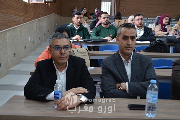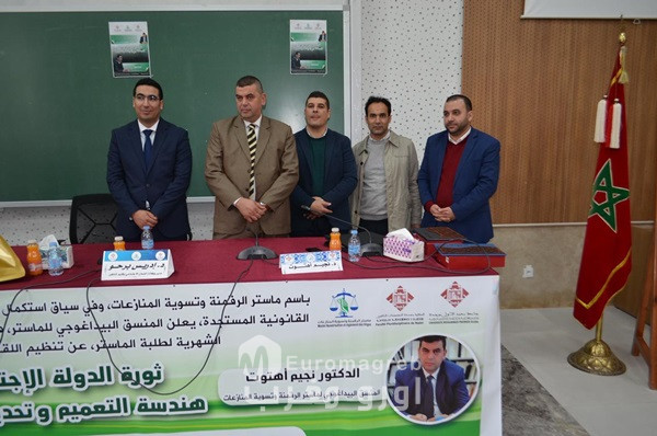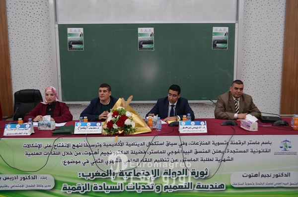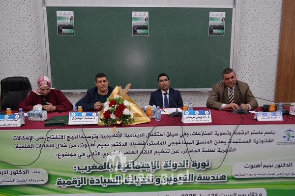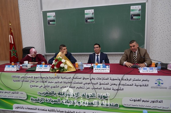 من جهته، أكد الدكتور نجيم أهتوت، أستاذ التعليم العالي والمنسق البيداغوجي لماستر الرقمنة وتسوية المنازعات، في كلمته، على أهمية هذه اللقاءات الشهرية في خلق فضاء علمي للنقاش والتفكير الجماعي، منوهاً بالمجهودات التي يبذلها رئيس الجامعة وعميد الكلية وكافة الأطر الإدارية والتربوية في سبيل الارتقاء بجودة التكوين الجامعي، ومبرزاً أن هذه المبادرات العلمية لا تندرج فقط في إطار التأطير الأكاديمي، بل تشكل جسراً حقيقياً يربط بين الفكر الأكاديمي والممارسة الميدانية، بما يعزز انخراط الطلبة في فهم التحولات الكبرى التي يعرفها المغرب، قبل أن يعطي الانطلاقة الرسمية لأشغال هذا اللقاء العلمي.