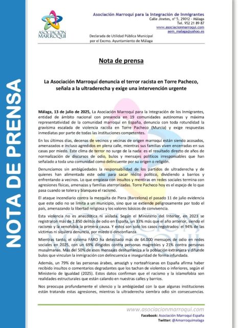 Como Asociación Marroquí para la Integración de los Inmigrantes, hemos presentado escritos oficiales ante la Delegación del Gobierno en Murcia y el Ayuntamiento de Torre Pacheco denunciando la grave situación que viven muchas familias.